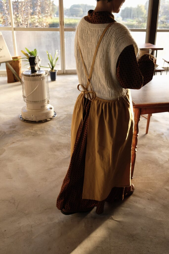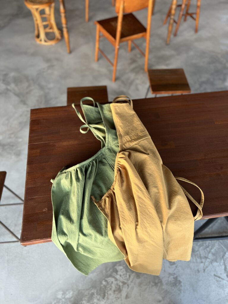 We make fabric pieces such as aprons, azuki bean warmers, and eco bags,